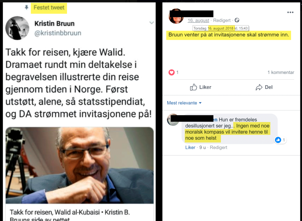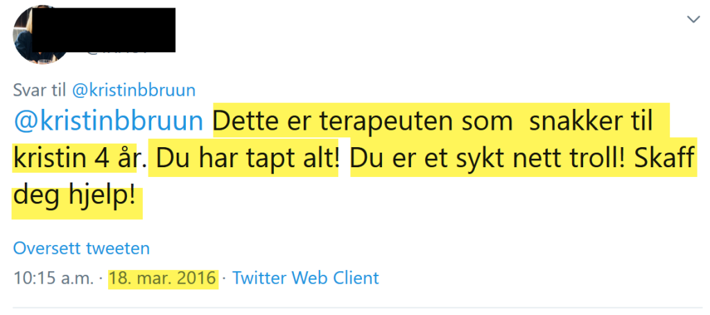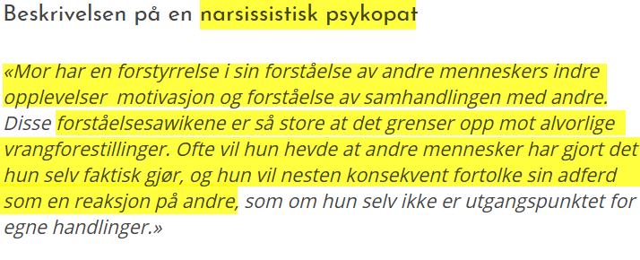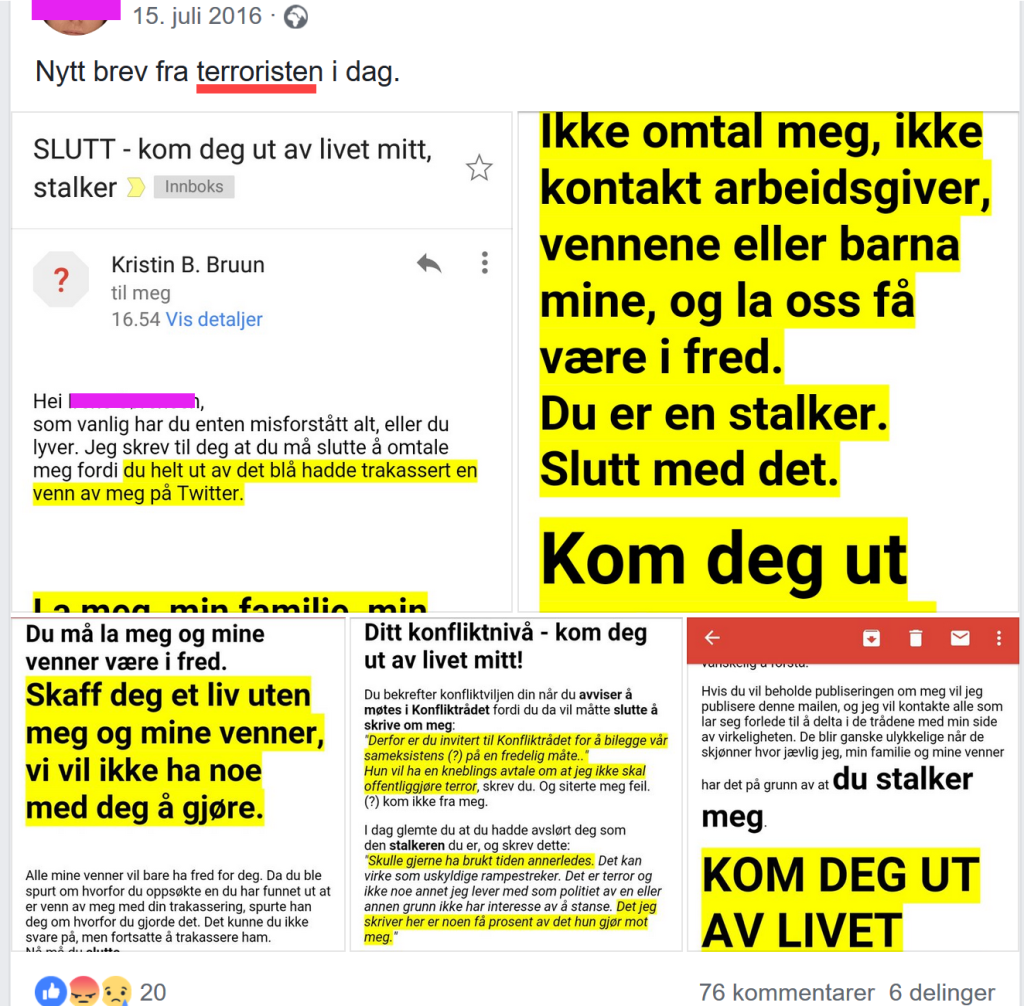 – Hun forfølger meg, det er tilnærmet tortur, sier kvinnen. Men senere, i samme samtale, innrømmer hun: – Det eneste motstykket til alt hun sprer om meg, er det jeg skriver om henne. Kvinnen fremstiller seg som et passivt offer, samtidig som hun aktivt driver en offentlig kampanje mot meg.