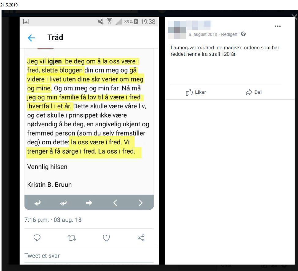 Dette er et talende øyeblikk: det angivelige offeret forsvarer ikke bare sine egne handlinger, hun forsøker å beholde et grep om narrativet. Ved å holde bloggen tilgjengelig, sikrer hun at hennes versjon av historien forblir synlig for fremtidige lesere.